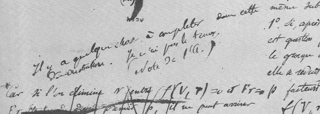 En 1831, un jeune Français, Évariste Gallois (sic), mort l’année suivante, avait annoncé, dans un mémoire présenté à l’Académie des Sciences, que “pour qu’une équation irréductible de degré premier soit soluble par radicaux, il faut et il suffit que deux quelconques des racines étant connues, les autres s’en déduisent rationnellement” : mais ce mémoire parut à peu près inintelligible aux commissaires chargés de l’examiner.